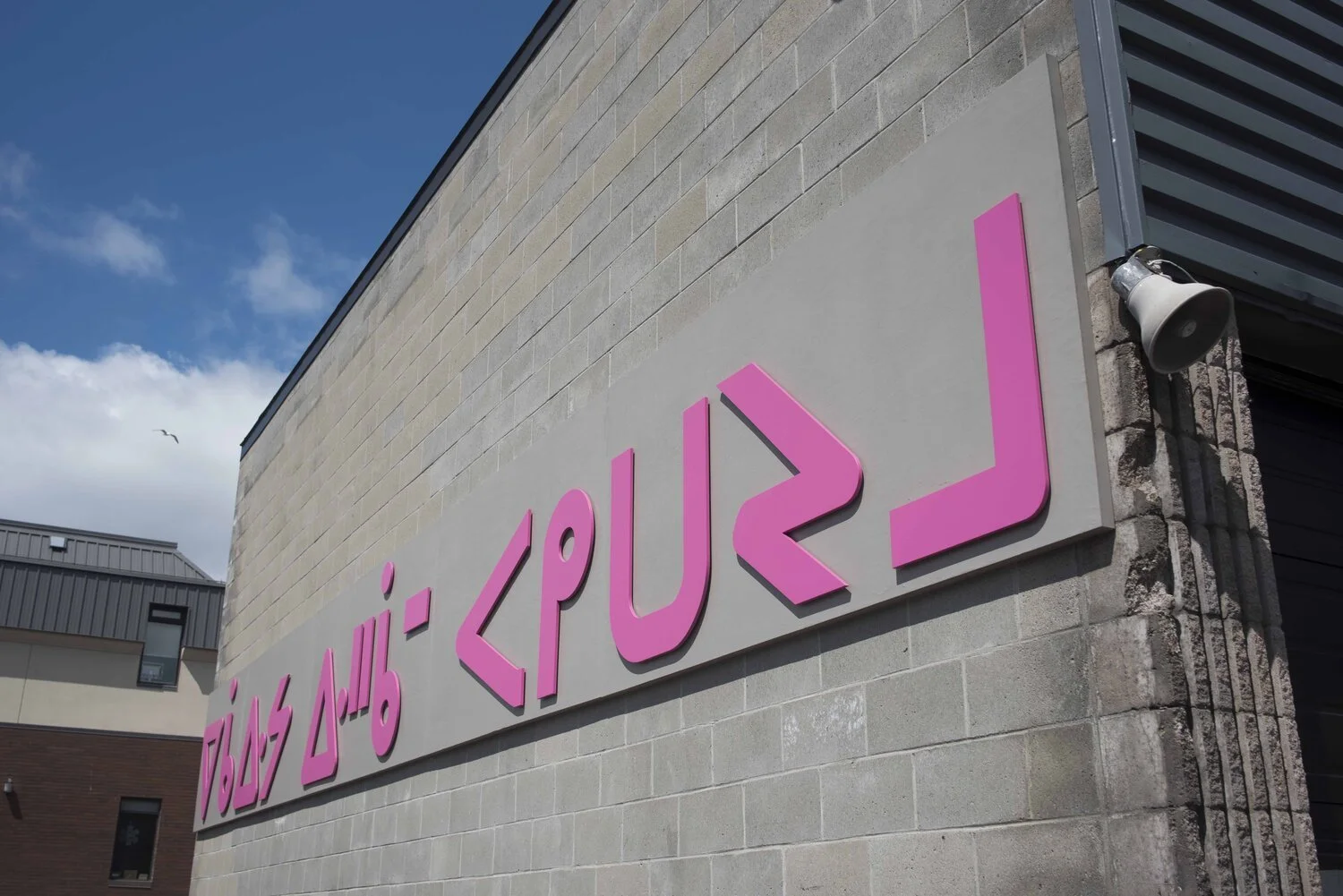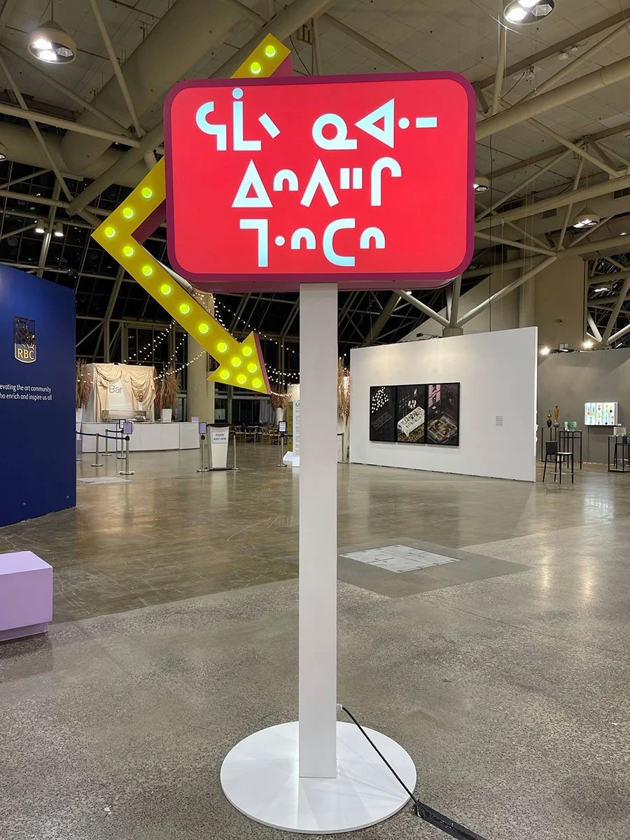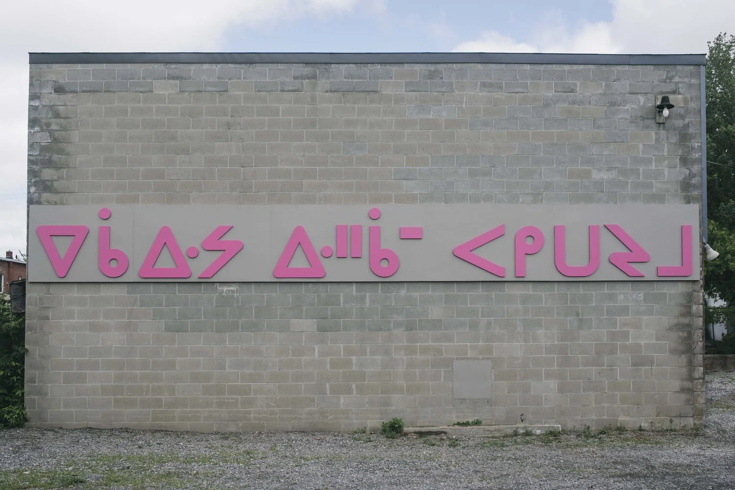 Joi T. Arcand’s practice includes photography, graphic design, and is characterized by a visionary and subversive reclamation and Indigenization of public spaces through the use of Cree language and syllabics. In her recent work with neon signs, Arcand connects to her complex relationship with the language by making it highly visible to the general public. Conversations from her inner-world as a nēhiyaw iskwēsis growing up on the Prairies are translated into nēhiyawēwin and reproduced in neon lights, creating an inviting and vibrant contradiction.